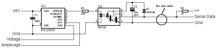 Voltage and current are read by a Microchip PIC12F615 using it's internal 10 bit ADC.
